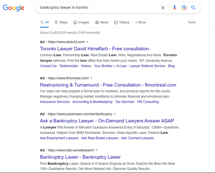 Here’s an example of the search results for bankruptcy lawyers in Chicago: